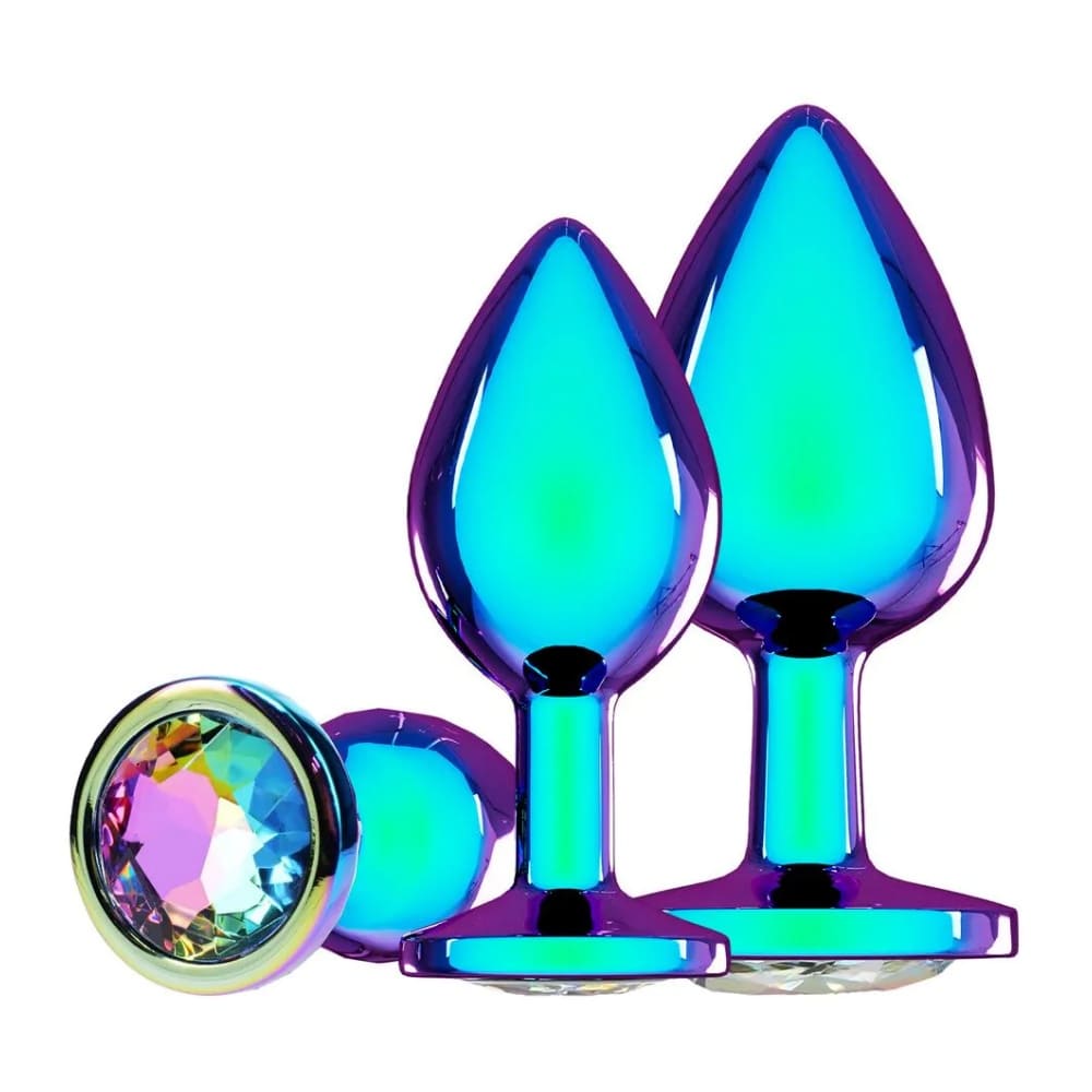 Изживейте изтънчена наслада с бляскавия комплект от три прелестно изработени метални анални плъга, вдъхновени от романтичния дух на Венеция. Със своята иридесцентна повърхност, която прелива в нюанси на синьо, лилаво и златно, този комплект съчетава лукс, чувственост и еротично изящество. Изработени от гладък, безопасен за тялото метал, плъговете имат ергономична форма за удобно и безопасно използване. Прецизно балансираното тегло осигурява дълбока и пълноценна стимулация, а блестящият кристал в основата придава визуален блясък и изкусителен финален щрих. Металът реагира на топлина и студ — охладете или затоплете плъговете, за да откриете нови усещания.