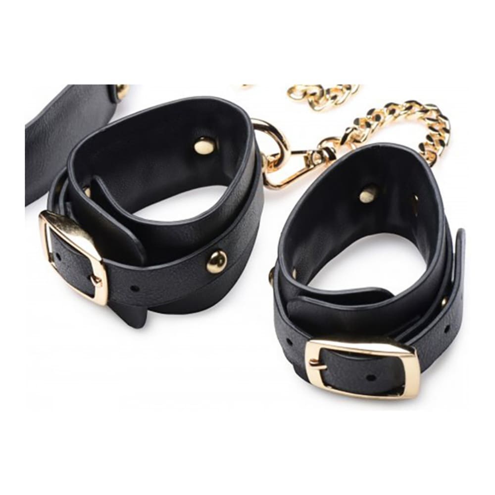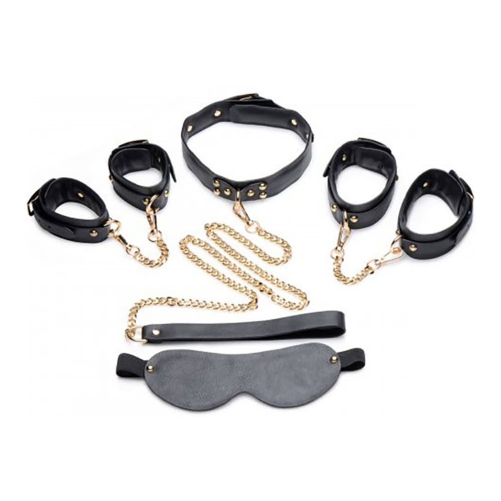 Перфектен за начинаещи BDSM откриватели, които искат да изследва дълбините на страстта си. Комплекта съдържа маншети за ръце и крака, нашийник и маска за очи изработени от веган кожа с мека подплата за комфорт. Подвижните златни вериги се прикрепят и отделят с лекота, така че да можете да позиционирате и задържате бързо и лесно - експериментирайте с различни позиции, за да намерите перфектния стил на игра!