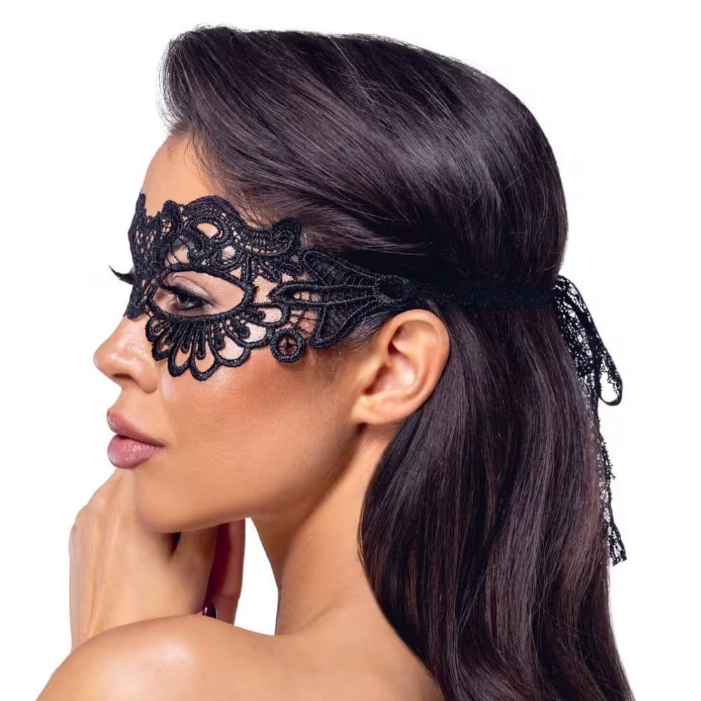 Тази изискана черна маска за очи е изработена от висококачествена, деликатно бродирана дантела, която докосва кожата като кадифе. Нейният елегантен дизайн с фини отвори за очи позволява игриви погледи, а дантелените панделки придават романтичен завършек и позволяват лесно и сигурно завързване.