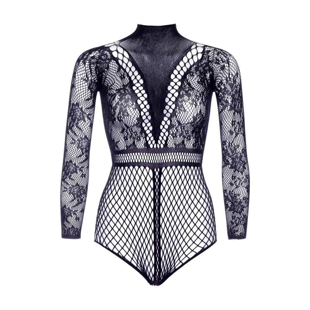 Потопи се в света на изкушението със смелост и съблазън в мрежа, комбинация от еротичен дизайн и практичност. Съблазнителната мрежеста структура подчертава извивките на тялото, а флоралните мотиви по ръкавите и гърдите добавят нотка на загадъчност. Еластичната материя следва извивките на тялото и пасва на различни фигури, докато закопчаването осигурява удобство и лесен достъп. Това е дръзко и секси бельо, създадено за специални вечери и моменти, в които искаш да излъчваш увереност и страст.
