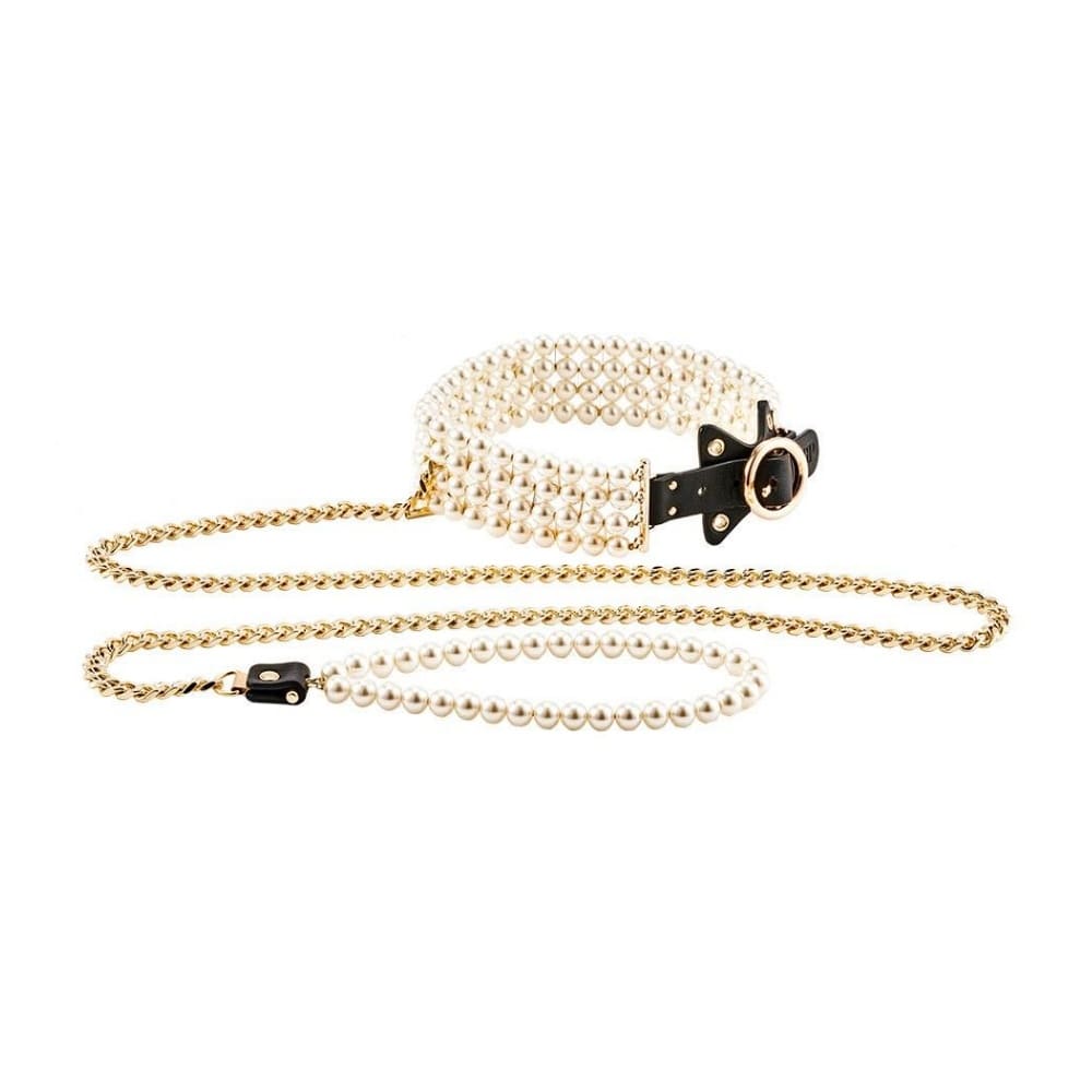 Този фетиш аксесоар комбинира чувственост, елегантност и власт. Вдъхновен от класическите BDSM аксесоари, той съчетава перлени акценти, висококачествена кожа и златисти метални детайли за изключителна визия и функционалност. Всяка перла по него е внимателно подбрана и подредена, за да добави визуален акцент и леко чувство на нежност върху кожата. Сиянието им контрастира с гладката текстура на меката веган кожа, докато златистите метални елементи подчертават луксозния характер на аксесоара. Тази комбинация от материали прави нашийника не само инструмент за контрол, но и истинско бижу за еротична визия.