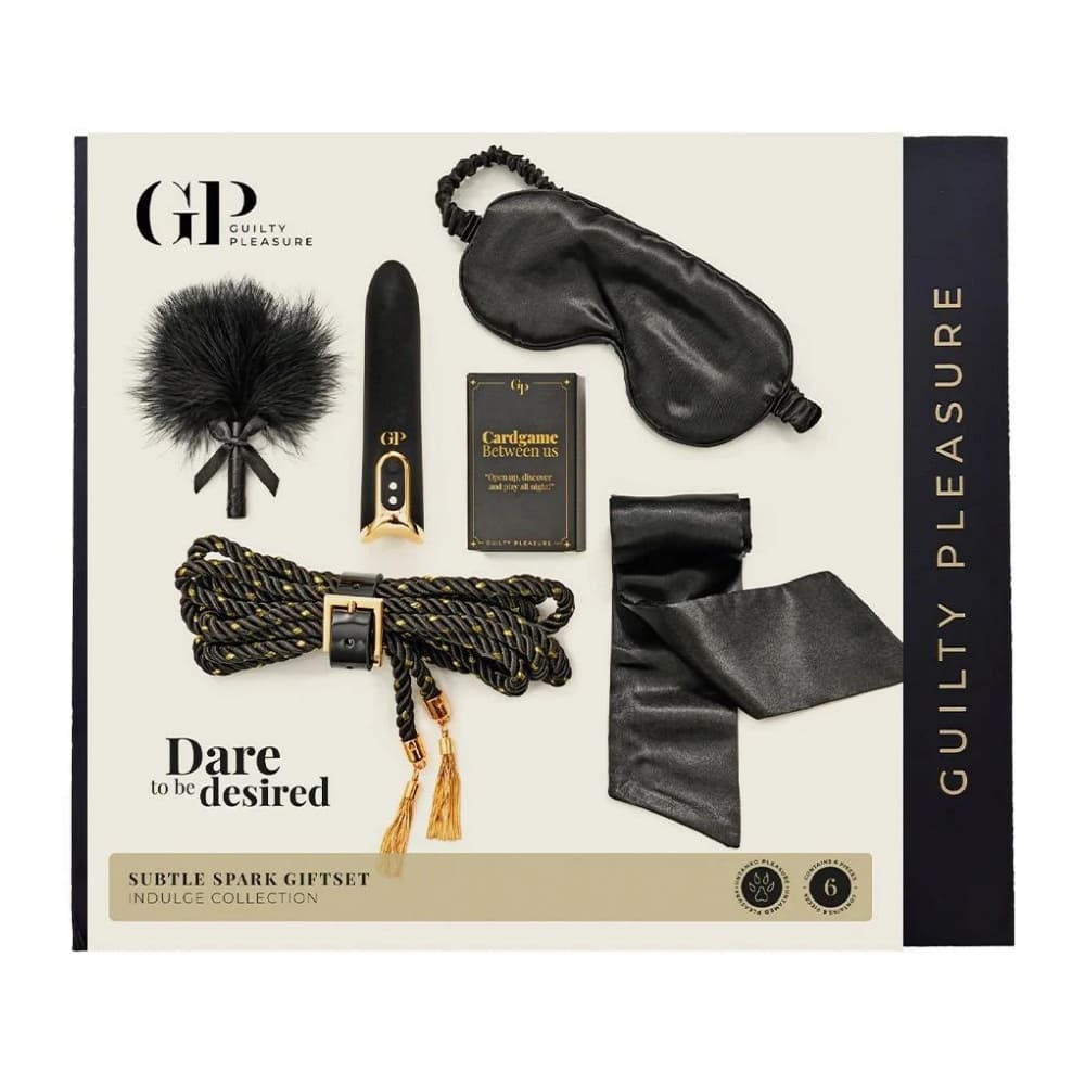 Подаръчният комплект Subtle Spark от серията Indulge на Guilty Pleasure е създаден за двойки, които искат да разпалят интимността си със стил, финес и щипка игриво предизвикателство. Този елегантен сет от 6 части комбинира нежност, мистерия и контрол – перфектната формула за чувствено приключение, което започва още с разопаковането.