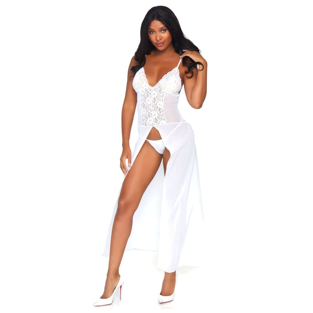 Събуди женствеността си с този смел и изключително съблазнителен сет, който комбинира изящна дълга рокля с висока цепка и подходящи прашки за завършена, чувствена визия. Създаден за специални поводи, когато искаш да бъдеш в центъра на вниманието. Високата странична цепка подчертава крака и придава дръзка нотка. Елегантно прилепналият силует оформя фигурата и подчертава извивките.