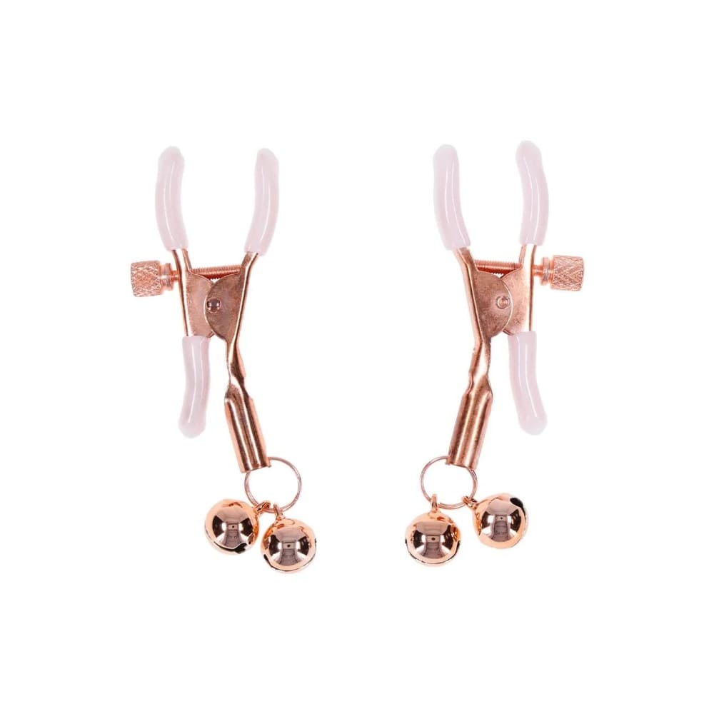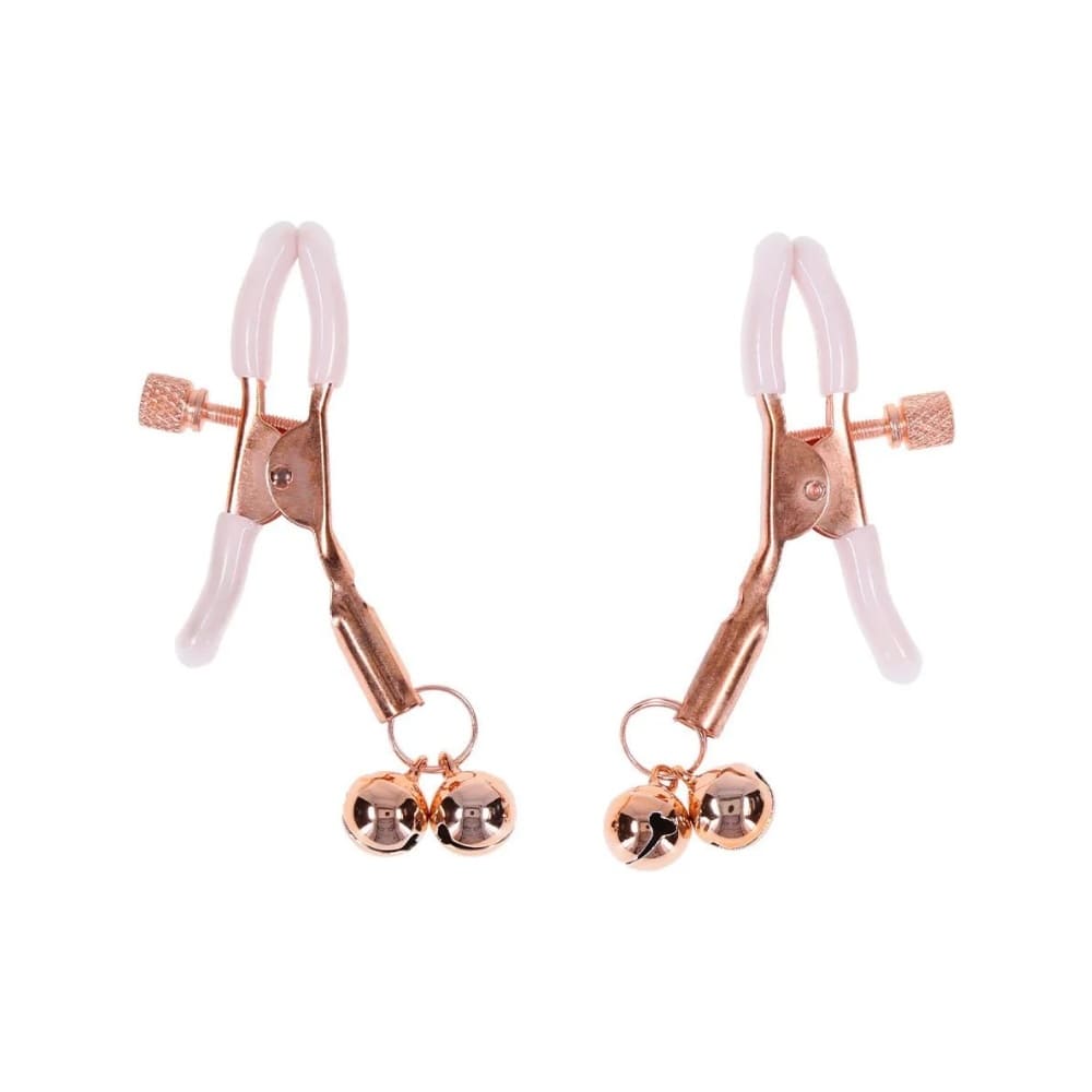 С тези щипки за зърна Peaches ’n CreaMe вие сте избрали точния аксесоар за чувствено удоволствие. Регулируеми и удобни, щипките се приспособяват към желаната от вас сила на натиска, като същевременно стимулират кръвообращението и увеличават чувствителността. Меките гумирани върхове осигуряват комфортен и сигурен захват, докато деликатните розово-златисти камбанки звънят при всяко движение – сигнал за върховно блаженство. Щипките са перфектният избор както за начинаещи в еротичните игри, така и за опитни любители на BDSM динамиката. Съчетайте ги с други аксесоари от серията Peaches ’n CreaMe за стилно и чувствено преживяване.