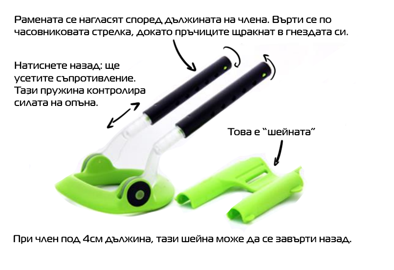- Чрез въртене и издърпване напред, рамената се нагласят така, че да отговарят на дължината на члена (до върха на главичката);