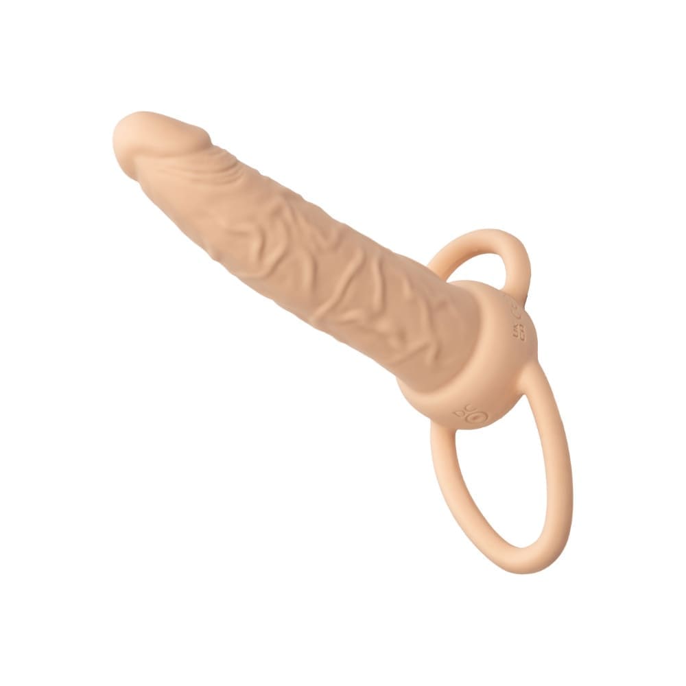 Вибраторът за дойно проникване ще изведе вашето стимулиращо действие до нови оргазмени висоти, защото е проектиран да доставя усещане за „изпълващо“ двойно проникване, на което вие и вашата половинка копнеете да се насладите. Универсалният, копринено гладък силиконов стимулатор с реалистична форма ви позволява да се наслаждавате на двойното забавление. В основата на пенетратора има еластични бримки, които удобно се плъзгат върху еректиралия пенис и осигуряват опора на тестисите по време на проникваща игра, като и там е позициониран интуитивен бутон за управление на десетте режима на вибрация, пулсация и ескалация, с които да засилите аналното и не само, експлоадиращо удоволствие. Вибраторът за двойно проникване и напълно водоустойчив и може да пробвате първата си тройка както под душ, така и във вана. За по-лесно и приятно проникване просто добавете желаното количество лубрикант на водна основа.