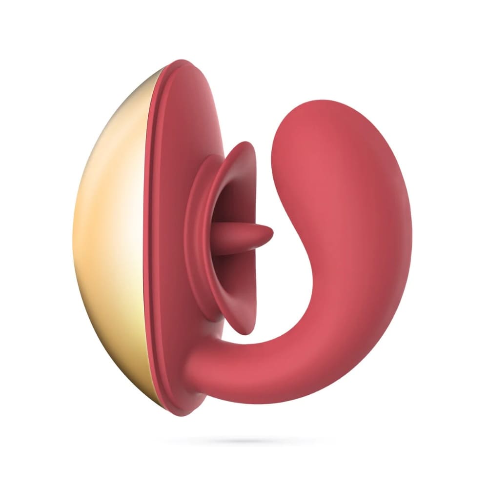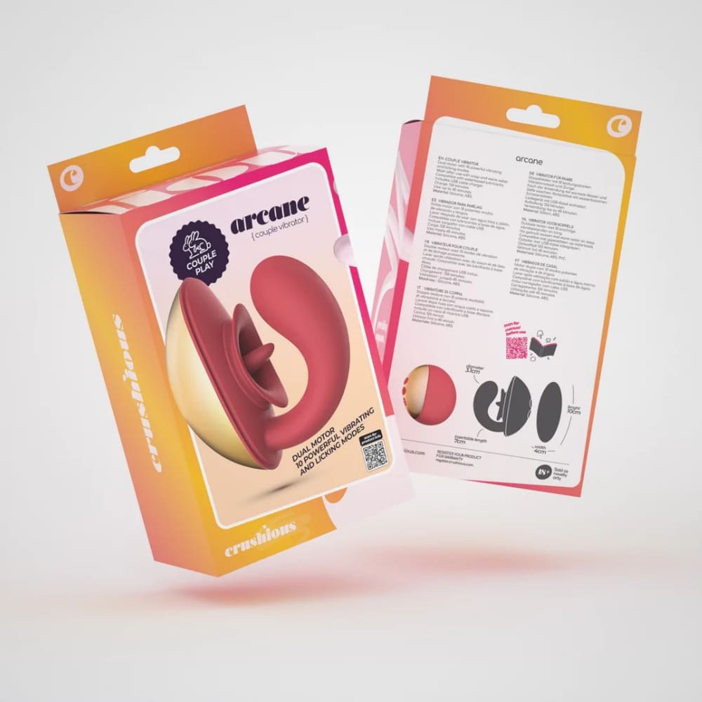 Потопете се в свят на неустоимо удоволствие с Arcane – Licking Couples Vibrator, иновативна секс играчка, създадена да разпали страстта и да изведе вашето интимно преживяване на изцяло ново ниво. Съчетавайки елегантен дизайн в червени и златни краски, луксозни материали и многофункционална стимулация, тази играчка е съвършеният избор за двойки, които търсят нещо повече от обикновената игра. Със специално проектирано езиче, който имитира движенията на истински език, Arcane ви дарява с невероятно реалистично усещане при клиторна стимулация. Седемте интензивни режима ви позволяват да изберете своята идеална вълна на удоволствие — от нежно галене до диво облизване. Създаден с мисъл за взаимно удоволствие, ергономична форма и гъвкав дизайн, които позволяват удобна употреба без прекъсване на интимността. Стимулира и двамата партньори — едновременно и без усилие. Изработен от копринено нежен и мек силикон, вибраторът е нежен към кожата и лесен за почистване. Водоустойчивият корпус ви кани да пренесете играта под душа или във ваната.