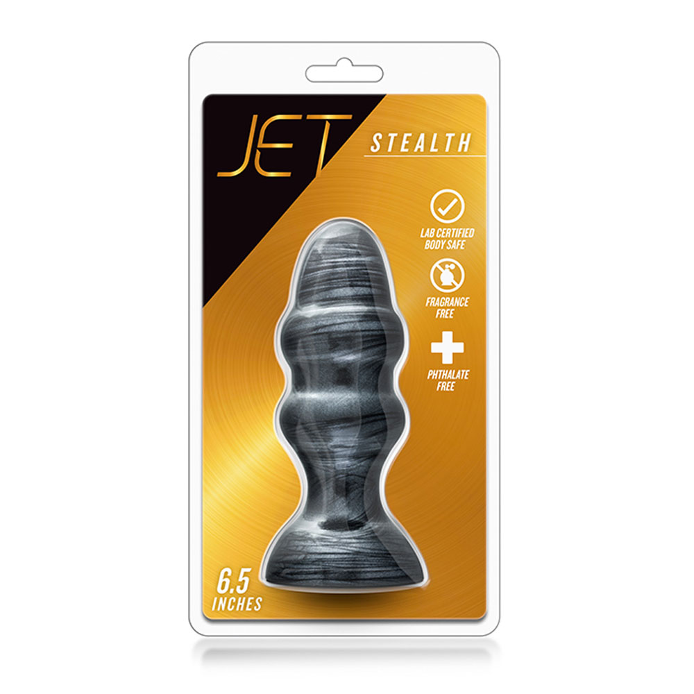 Jet’s latest and greatest. The Stealth is a Pro sized butt plug that looks sleek and menacing with a Jet Black Carbon Metallic Finish is made from lab tested body safe non porous PVC. Play Hard. Play Safe. This anal plug is for the advanced user. Soft, flexible and it's tapered shape allows for easy and comfortable insertion. The sturdy suction cup base sticks on any smooth flat surface and prevents “overinsertion”. Wash with soap and water before and after each use. Pat dry with a clean dry cloth.