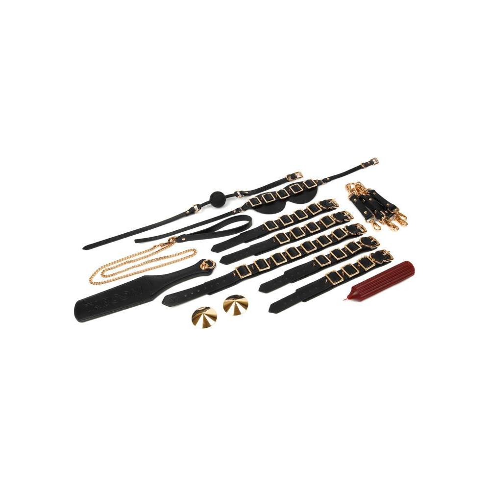 - Съдържание: Нашийник с повод, белезници за китки, белезници за глезени, превръзка за очи, топка-гаг, палитра, лепенки за зърна, BDSM свещ и др.