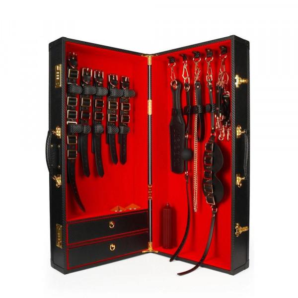 Вътре в привличащия погледа куфар ще откриете всичко необходимо за една незабравима вечер: съблазнителен нашийник с повод, елегантни белезници за ръце и глезени, сензуална превръзка за очи, закачлив гаг, гладка палитра за пляскане, изкусителни лепенки за зърна и BDSM свещ за горещи моменти. Всеки детайл е изработен от ултра мека черна веган кожа, подчертана от златни шипове и метални елементи без съдържание на никел. Куфарът е проектиран така, че никой да не подозира за тайните, скрити зад неговия луксозен екстериор, което го прави идеален за пътуване. За максимална сигурност и лична неприкосновеност, куфарът разполага с кодова ключалка (стандартен код 0000), която можете да персонализирате чрез сканиране на вградения QR код.