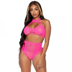 Секси комплект топ и бикини от ситна полупрозрачна материя в който  умело се редуват различни по големина отвори, които ще направят тялото ви още по-сластно и желано. Покриващ част от тялото, този комплект създава визуална илюзия за тайнственост, като същевременно загатва сластно прелестите ви.