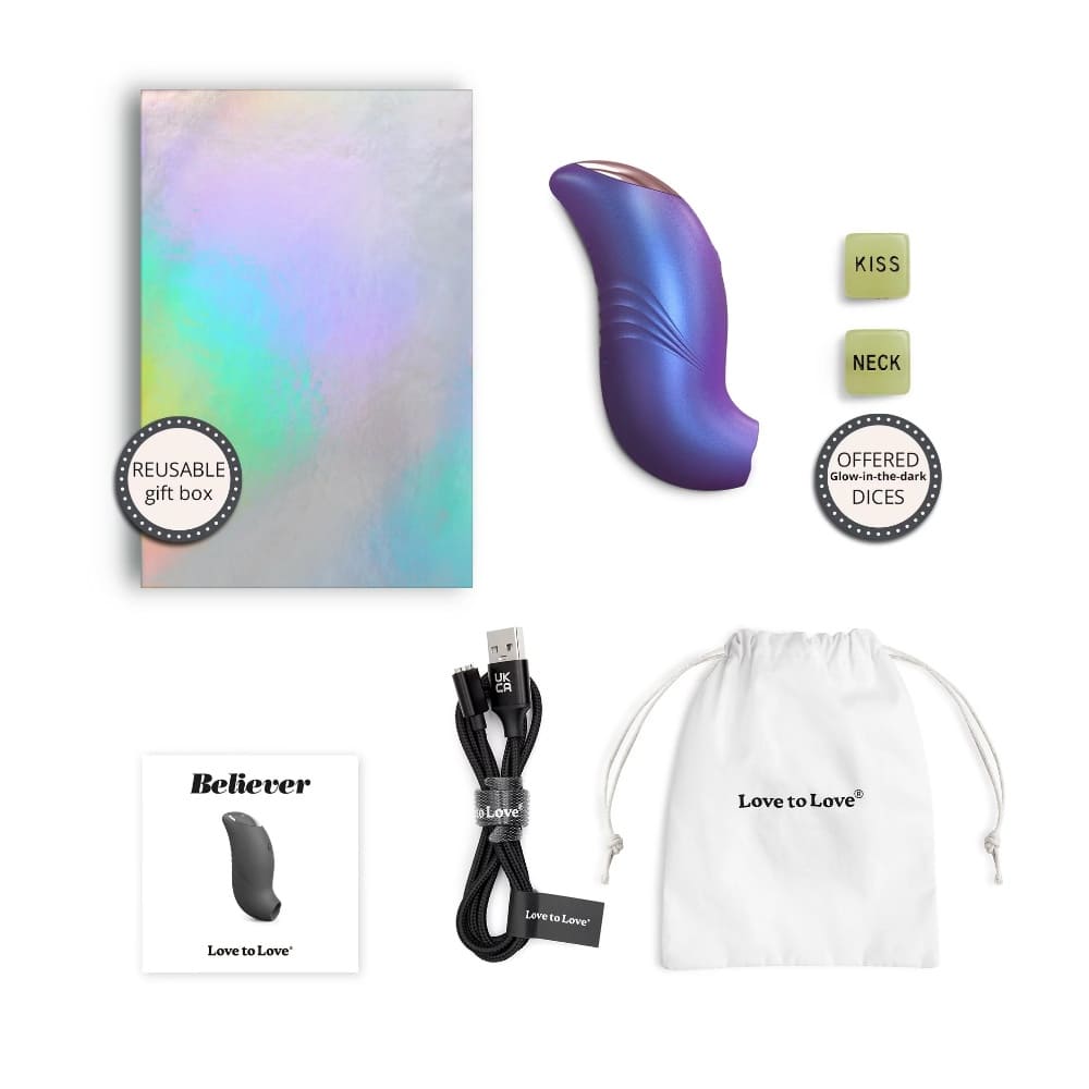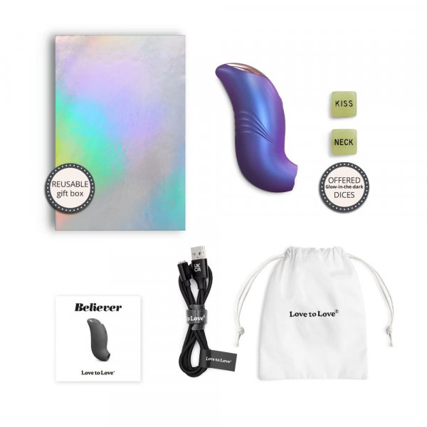 Believer от LoveToLove® е вашият билет за свят на неизследвани усещания. Все едно държите късче от рая в дланта си. Този невероятен спътник има Flapping дизайн, уникална функция, която създава симбиотична връзка между потребителя и устройството. Ритмичните движения нагоре и надолу на езичето му карат гъвкавата силиконова мембрана да пърха нежно над клитора ви, а изключително меката "уста" на Believer нежно обгръща клитора и действа като звукова кутия. С пет различни режима на движение можете лесно да персонализирате изживяването си, за да постигнете перфектното ниво на стимулация. LED екрана в задната част на устройството светлинно индикира смяната на режимите, дори и в най-тъмната част на нощта. Ергономичният дизайн на Believer е идеално адаптиран към ръката ви, превръщайки употребата му в истинско удоволствие. Но забавлението не спира дотук. Believer е напълно водоустойчив, което го прави перфектният спътник за релаксираща вана или душ. А компактният му размер ви дава възможност да го вземете със себе си, където и да отидете.