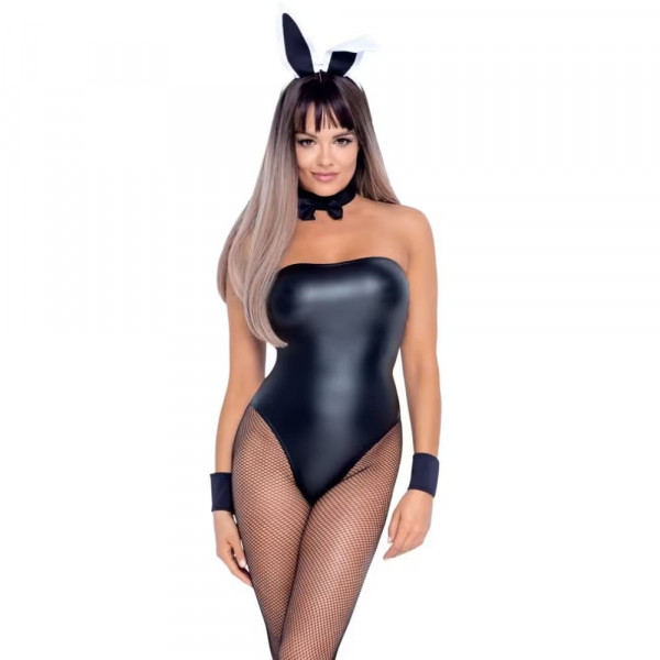 Костюмът се състои от пет части: матово, еластично боди без презрамки, пухкава и закачлива опашчица, стилни маншети за китките, диадема с плюшени заешки уши и яка с папийонка.