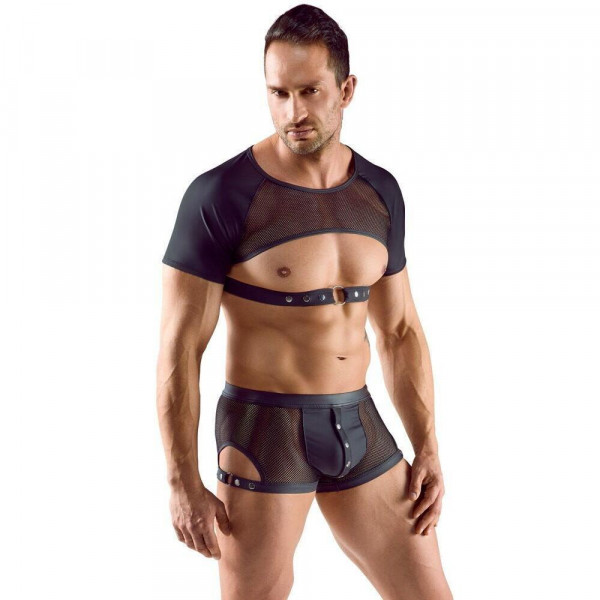 Изработена от висококачествена материя с матов ефект, тя прилепва плътно по тялото, подчертавайки всеки релеф на вашата мускулатура. Предната част е акцентирана с прозрачна мрежеста вложка, която добавя визуална дълбочина и загадъчност към визията. Най-впечатляващият елемент е напълно изрязаният дизайн на гърдите, подчертан от масивен мъжествен колан под бюста. Коланът разполага с декоративен метален ринг в центъра и може да се регулира прецизно чрез тик-так копчета, за да пасне идеално на вашата фигура. Материята е изключително мека и еластична, което гарантира пълен комфорт, независимо дали сте на тематично парти или в интимна обстановка.