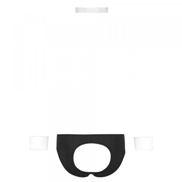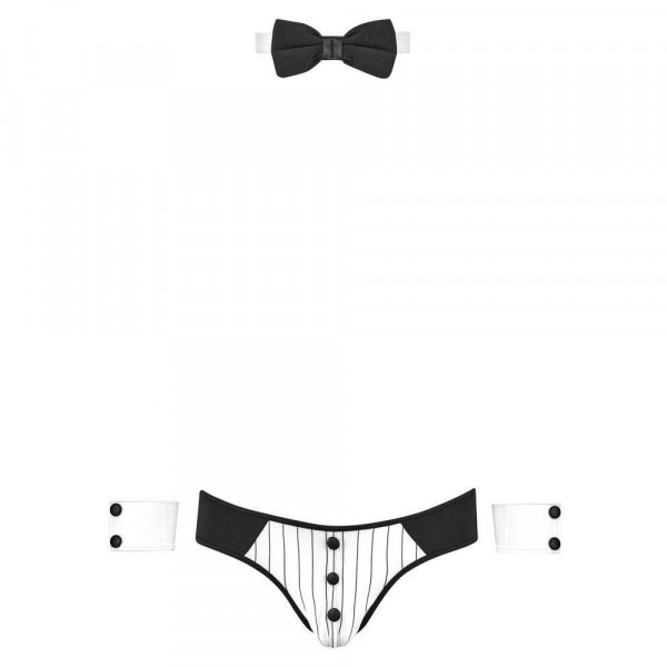 Сетът включва четири основни елемента, които мигновено изграждат визията на изкусителния иконом. Централният елемент са еластичните бикини тип „jockstrap“, които са напълно отворени отзад (bumless) за максимална провокация. Предната част е детайлно изработена с вложка на фино райе и декоративни копчета, придаващи официален и строг вид. За да бъде преобразяването пълно, комплектът включва елегантна папионка и два маншета за китките, които завършват „джентълменския“ стил. Материята е изключително мека и силно разтеглива, осигурявайки перфектно прилягане и пълна свобода на движенията по време на вашите интимни игри.