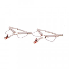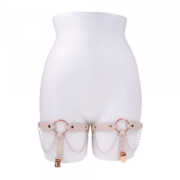 Потопете се в разточителния свят на колекцията Peaches ’n CreaMe с тези съблазнителни жартиери, подчертани с перлен блясък и фини златисти детайли. Те са създадени да обгръщат бедрата ви с мекота и стил, като всяко движение се превръща в покана за изкушение. Изработени от веган кожа с нежен прасковен финиш, те галят кожата и създават усещане за лукс, докато фините перлени нишки добавят деликатна текстура, която въздейства не само визуално, но и чувствено.  Златистият O-пръстен в предната част придава фокус и характер, а функционалните клипси позволяват стабилно захващане на чорапи или допълнителни аксесоари. Регулируемият дизайн ги прави подходящи за различни форми и размери, като осигурява комфорт, сигурно фиксиране и изкусителна визия.